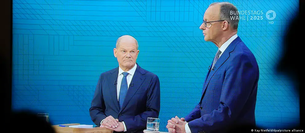 ایس پی ڈی کے رہنما اور چانسلر اولاف شولس اور ان کے اہم حریف قدامت پسند سی ایس یو ⁄ سی ڈی یو بلاک کے فریڈرش میرس کے درمیان پہلے اہم مباحثے میں دونوں رہنماؤں نے ملک کے مستقبل کے حوالے سے اپنے خیالات پیش کیے۔