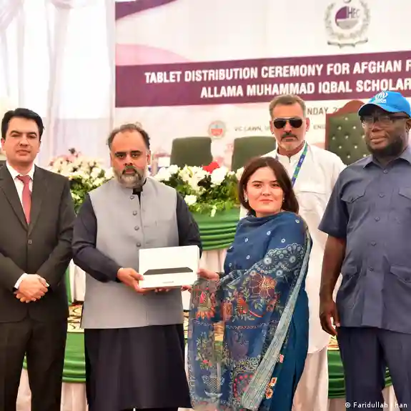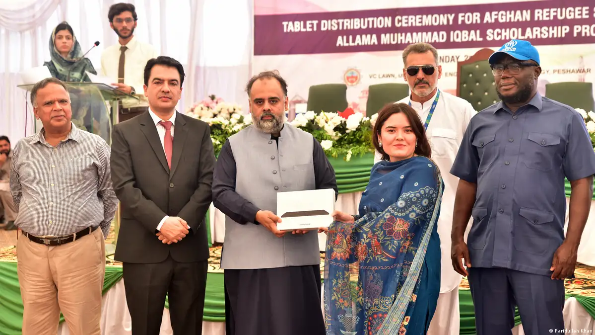 ایک طرف حکومت پاکستان ملک میں غیرقانونی طورپرمقیم افغان باشندوں کو گرفتارکر کے واپس اپنے ملک بھیج رہی ہے تو دوسری جانب یہاں سرکاری اورنجی تعلیمی اداروں میں زیرتعلیم طلبہ کو سہولیات فراہم کرنے کے لیے اقدامات کیے جا رہے ہیں۔ پاکستان کے مختلف نجی وسرکاری تعلیمی اداروں میں زیرتعلیم 275 طلبہ کوحال ہی میں ٹیبلٹ کمپیوٹرز فراہم کیے گئے۔ یونیورسٹی آف انجینئرنگ اینڈ ٹیکنالوجی پشاورمیں منعقدہ اس تقریب میں ملک بھرسے آنیوالے سینکڑوں کی تعداد میں افغان طلبہ نے شرکت کی۔ علامہ اقبال اسکالرشپس کے تحت تعلیم حاصل کرنے والے ان طلبہ کواقوام متحدہ اورہائرایجوکیشن کی باہمی معاونت سے معلومات تک آسانی سے رسائی کے لیے ٹیبلٹس کمپیوٹرز فراہم کیے گئے۔