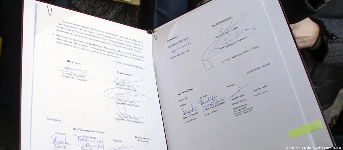 یوکرائن میں حکومت اور اپوزیشن کے درمیان طے پانے والی ڈیل جرمن وزیر خارجہ فرانک والٹر اشٹائن مائر، فرانسیسی وزیر خارجہ لاراں فابیوس اوریوکرائن کے ثقافتی روابط کے حامل ملک پولینڈ کے وزیر خارجہ راڈو سلاو سیکروسکی کی مسلسل رابطہ کاری کا نتیجہ ہے۔ تینوں وزرائے خارجہ یورپی یونین کے نمائندوں کی حیثیت میں کییف میں ثلثی کے فرائض سرانجام دے رہے تھے۔