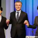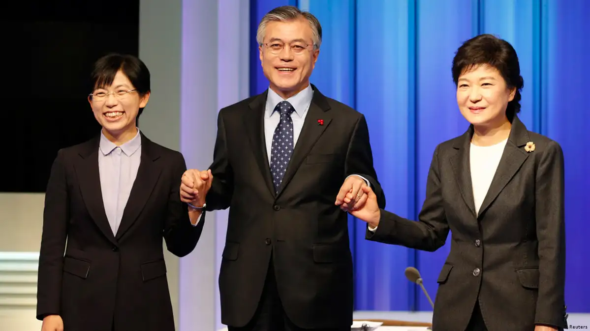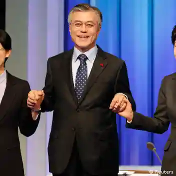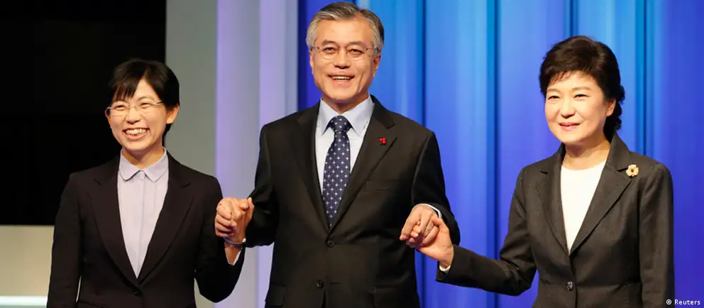 Source News Feed: EMEA Picture Service ,Germany Picture Service South Korea's presidential candidates (L-R) Lee Jung-hee of opposition Unified Progressive Party, Moon Jae-in of the main opposition Democratic United Party and Park Geun-hye of ruling Saenuri Party pose before a televised debate in Seoul December 4, 2012. Conservative and right wing Park who is the daughter of late South Korean military dictator Park Chung-hee and the former human rights lawyer Moon participated in a debate over security policy as North Korea readied a rocket launch that will coincide with the South's Dec. 19 presidential election. REUTERS/Lee Jae-Won (SOUTH KOREA - Tags: POLITICS ELECTIONS)