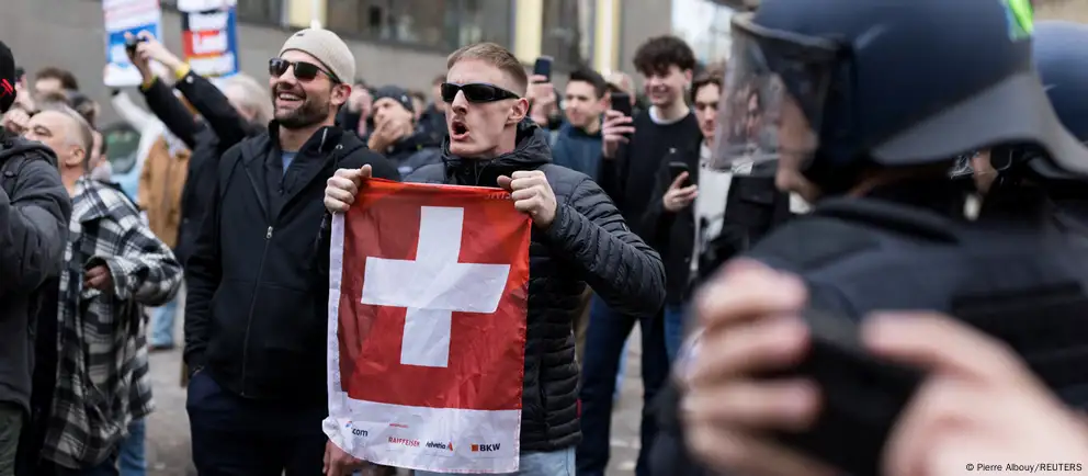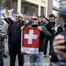 周六,反对选择党严格移民政策及其他立场的人们在瑞士小镇艾因西德伦(Einsiedeln)游行抗议。抗议者高呼“纳粹滚出去”,并举着写有“1933年绝不重演”等标语的牌子——1933年是指希特勒上台的那一年。在这场获得批准的抗议活动中,警方一度临时拘留了5人。