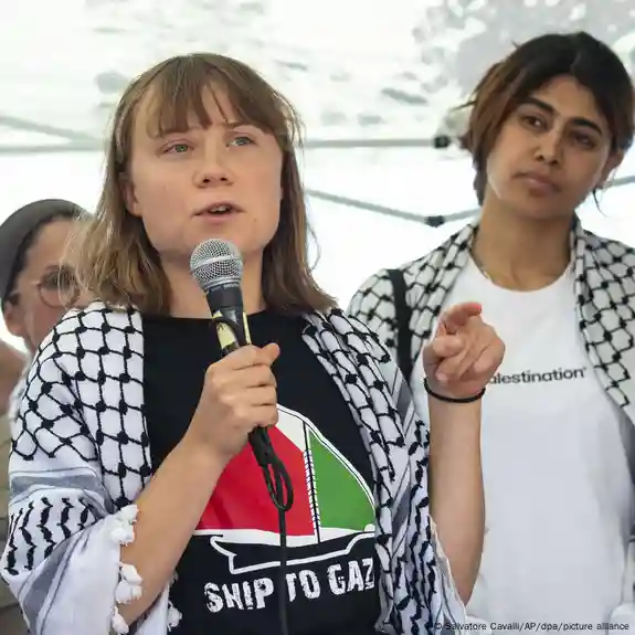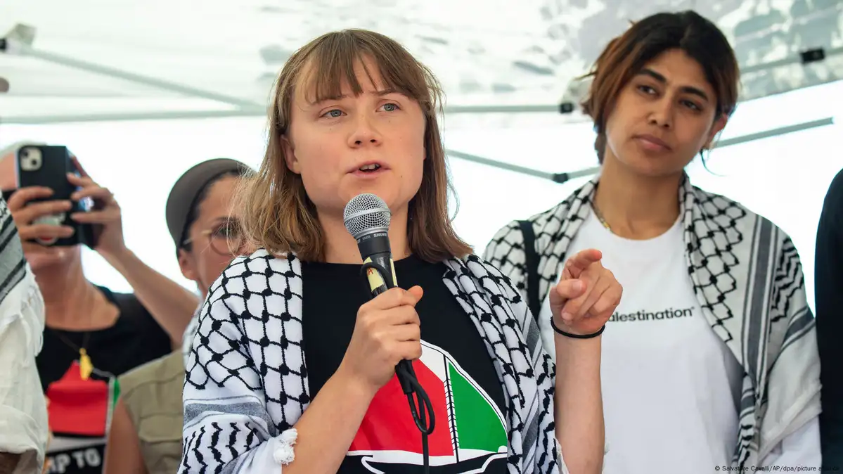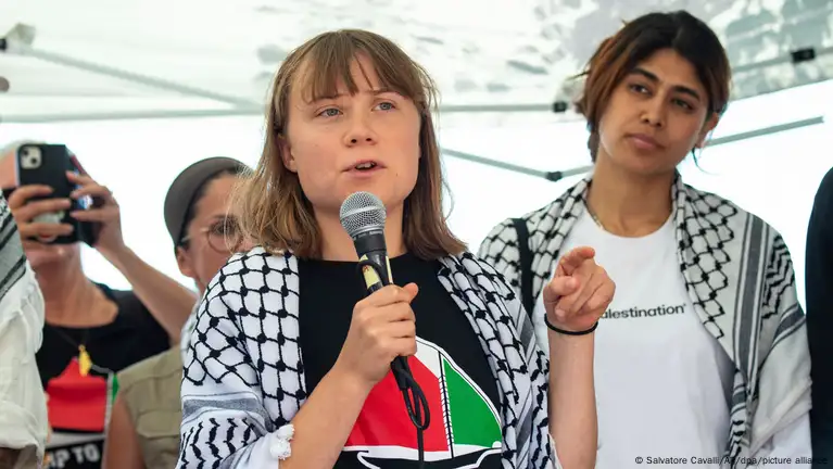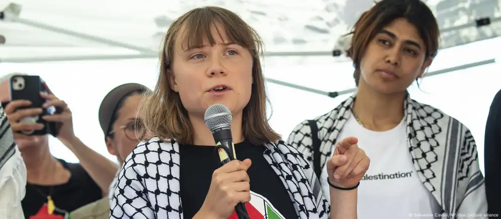 (德国之声中文网)22岁的瑞典环保人士通贝里与另外11名志愿者从意大利西西里港扬帆出海,尝试经海路运送物资至加沙。在启程前的新闻发布会上,通贝里表示,世界不能袖手旁观。她对媒体说,“行动再危险,都不及世界对眼前正在上演的种族灭绝默不作声这般可怕。”