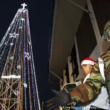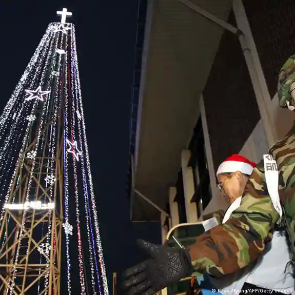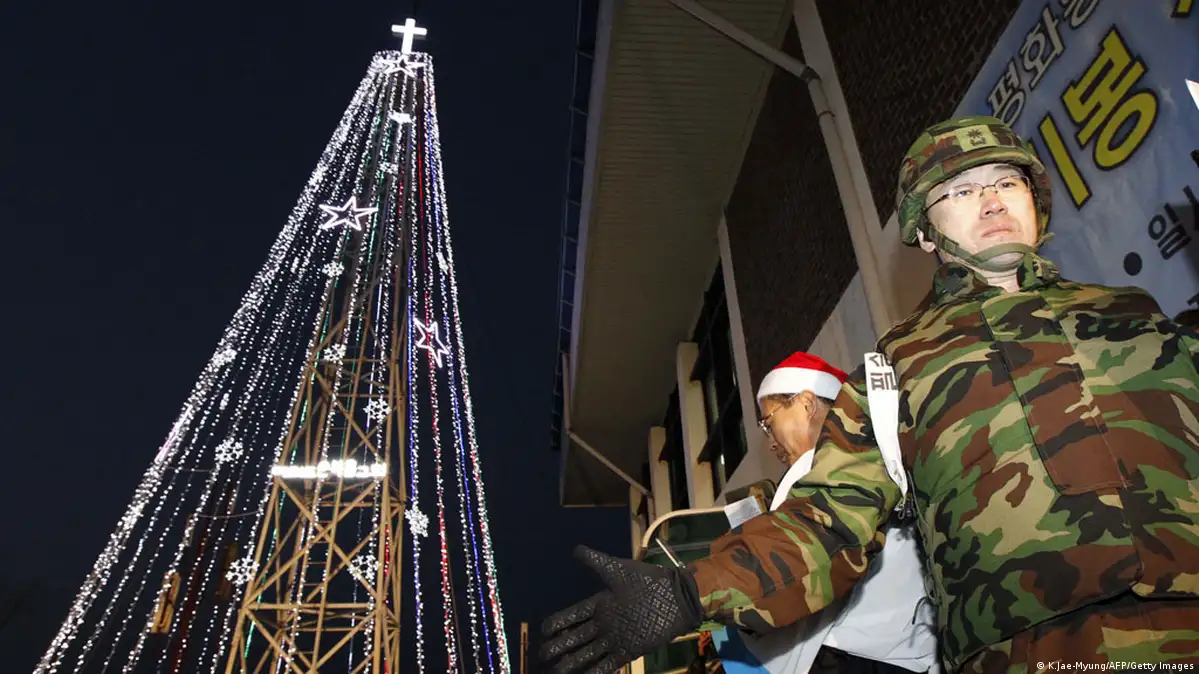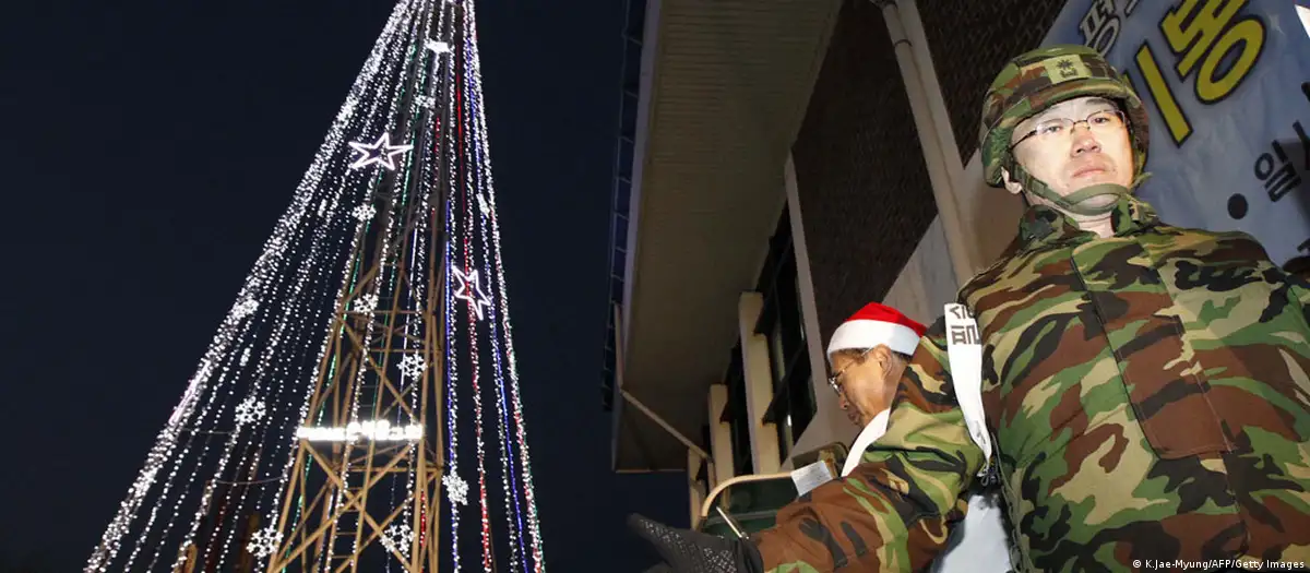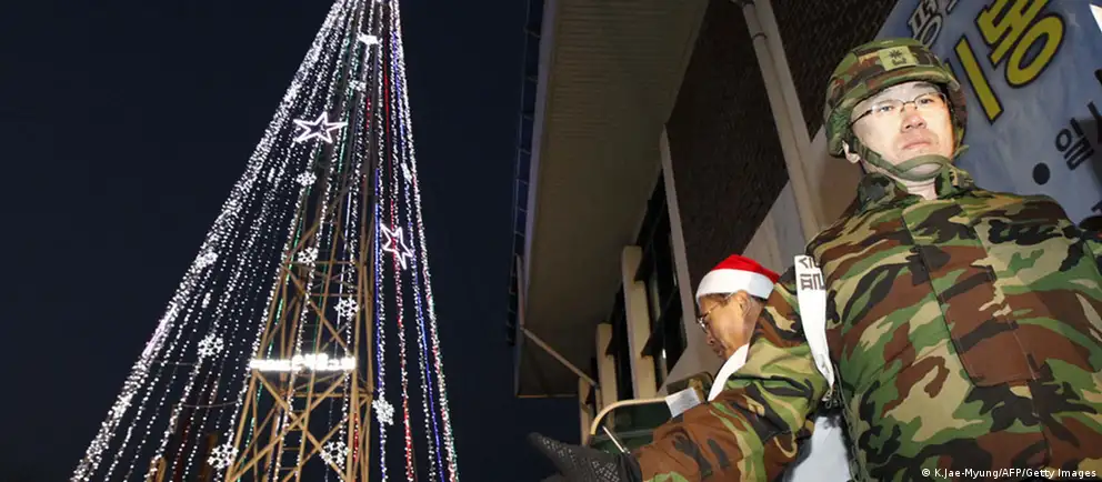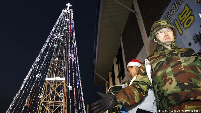 韩国在与朝鲜边界处设置一个巨型的圣诞树形状的灯光设施。韩国国防部表示,基督徒获准在一座巨大的铁塔上点灯,直到1月2日。这座铁塔位于一座山丘上,距离军方监控下的双方停火线仅数公里,可从朝鲜一座边界城市看到。去年,韩国方面没有点亮灯光以避免与朝鲜发生冲突。平壤指责韩国试图通过圣诞树让朝鲜民众归信基督教。
