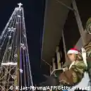 A South Korean military officer stands guard as Christians prepare a lighting ceremony in front of a Christmas tree atop a military-controlled hill near the tense land border in Gimpo, west of Seoul, on December 21, 2010. South Korean marines were on guard on December 21, to protect a Christmas tree, the latest focus of tensions with North Korea following Seoul's artillery drill near the disputed sea border a day earlier. AFP PHOTO / KIM JAE-MYUNG (Photo credit should read KIM JAE-MYUNG/AFP/Getty Images)
